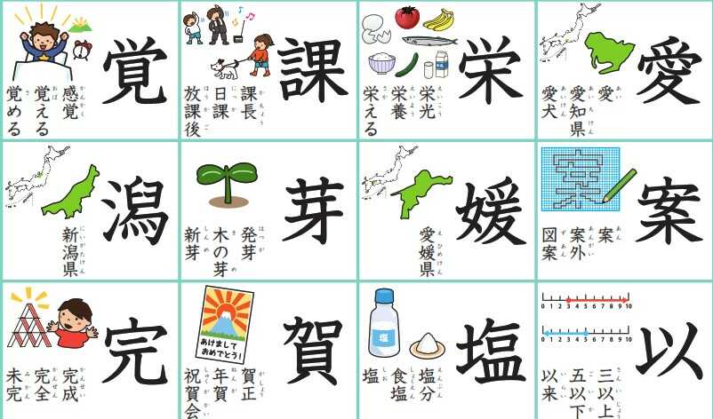 Kanji (details including usage and reading) that Japanese elementary school students need to master.