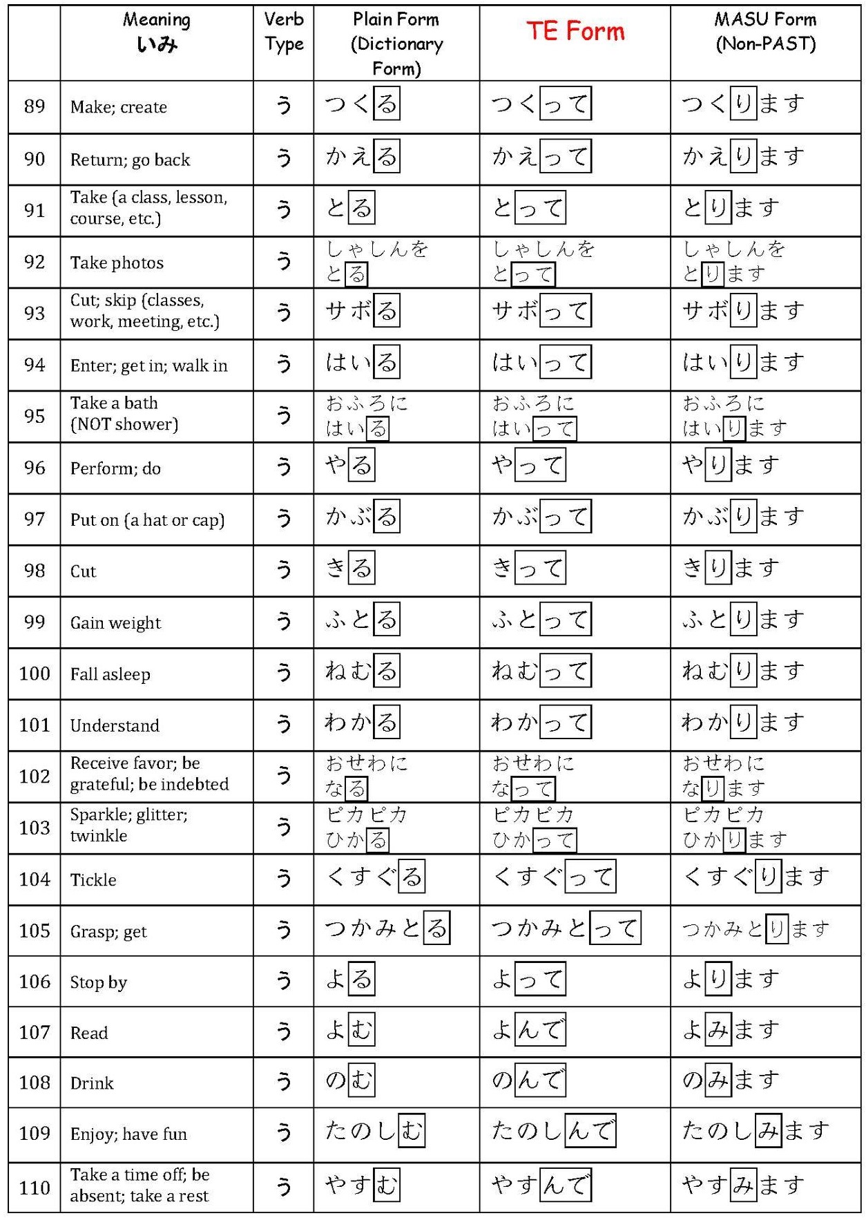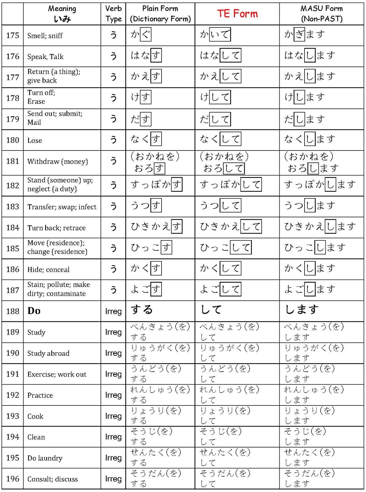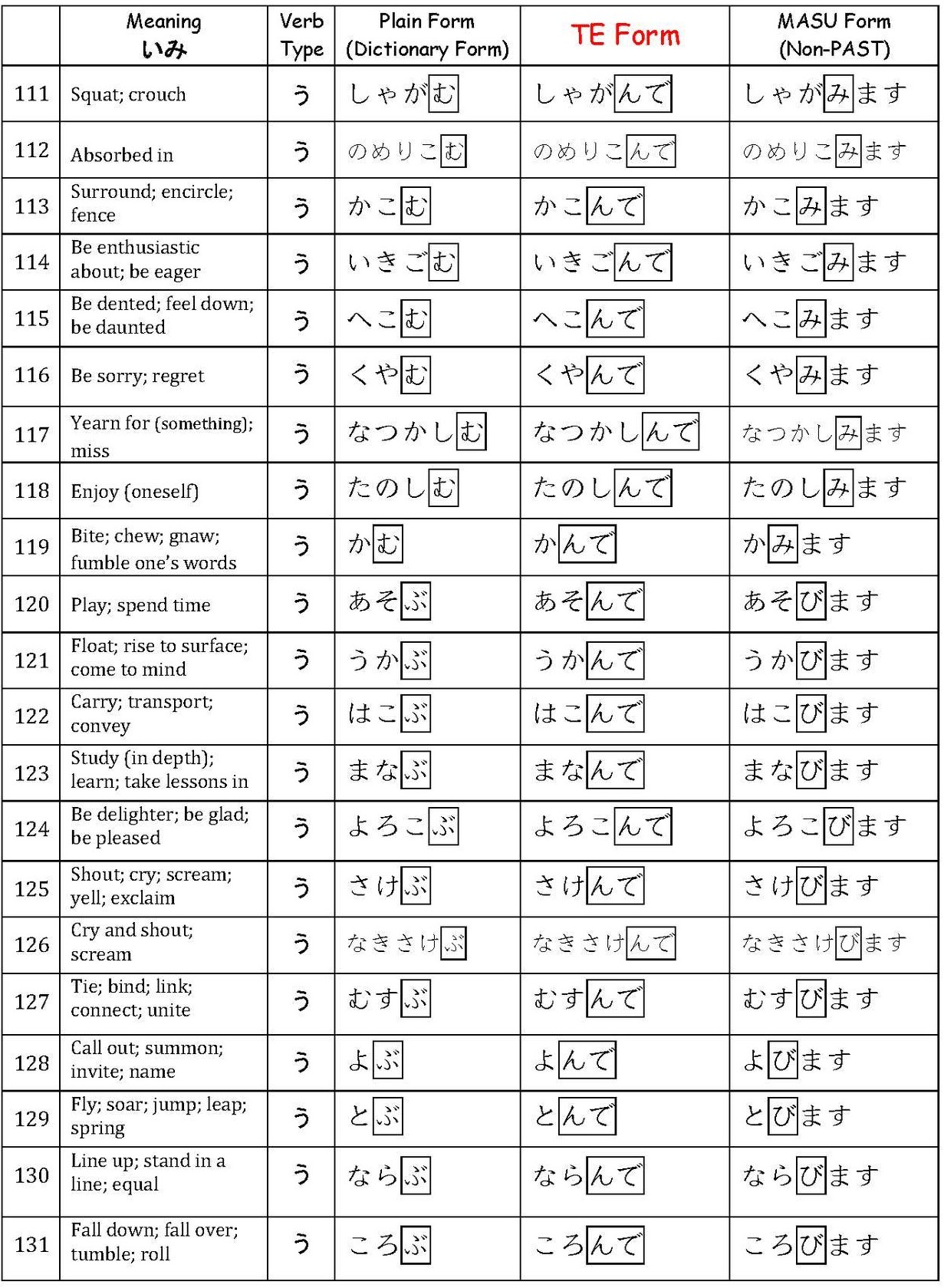 Verbs て-Form List